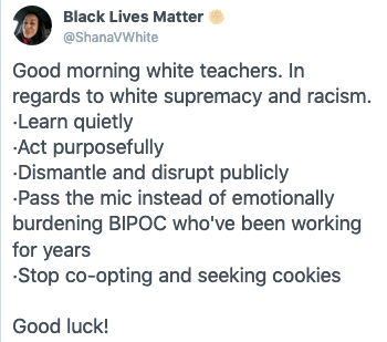 If we aren’t prepared to tackle the systemic racism that you find in our lessons, in our school, in our curriculum, in our materials, in our education system, in our society, and most importantly, in ourselves, then that square we posted isn’t just blank, it’s hollow. We need to ask ourselves what we need to learn and then do in order to achieve this, and then ask ourselves if we’re actually prepared to do it, because it won’t be easy, it will be difficult. If we want to do the right thing, we have no other choice. This is our fight, it’s all of ours, so make a decision, learn, and act.